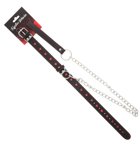 You'll fall in love with this heart collar and leash set. 53X delivers this genuine leather bondage collar for your kinky pleasure! The thin band features little red hearts  and a solid loop ring hanging in the front. The buckle strap is adjustable to fit almost any wearer. Attach your own personal charm, or use the included leash to intensify your thrilling bondage play!