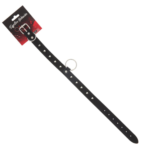 53X delivers this genuine leather bondage collar for your kinky pleasure! The thin band features raised metal rivets and a solid loop ring hanging in the front. The buckle strap...