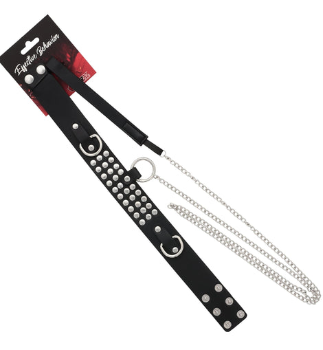 For your sexy bondage play, look the part in this riveted collar by 53X! The faux leather collar features four rows of flat rivets sandwiched between two D-rings and above a 1.25" O-ring with an attached 48" matching chain leash. Adjust the collar to the desired fit with the nickel-free snaps and prepare for whatever the night may bring!