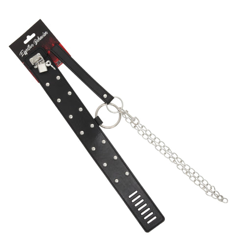 For your sexy bondage play, look the part in this bold riveted collar by 53X! The wide PVC band features two rows of flat rivets along the edges and a 1.5" O-ring at front makes it easy to attach the matching leash. Easily secure the included Gasp latch style lock, not only is this a quality collar but also a fashion statement.