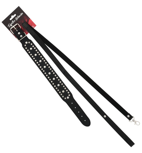 Enhance the mood with this fierce fetish collar by 53X! This black faux leather collar has a medium width with three rows of nickel-free rivets. The buckle strap allows for an adjustable fit and easy removal. Use the matching leash which is included for additional control.
