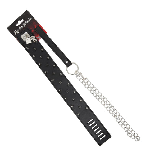 Step up the traditional BDSM game with this quality leather spiked collar, featuring 26 spikes that run the length of the collar around the neck. Easily secure the included Gasp latch style lock as well as the included matching leash. Not only is this a quality collar but also a fashion statement.