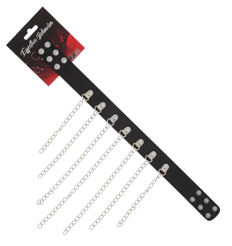 Draw attention with this bold fashion collar by 53X! Perfect for a night out or a night in the bedroom, this collar boasts seven hanging chains in the front that end in a perfect taper. The easy snap-buttons in the back provide three different sizes and makes this collar the perfect accessory for throwing on taking right off!