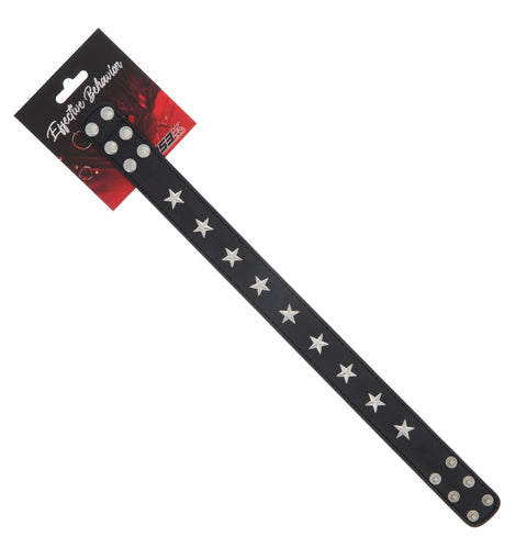 Feel like the star you are while wearing this studded fetish collar by 53X! Glinting star-shaped rivets trail along the length of this black premium PVC band. Simply find your desired size with the adjustable snap-buttons in the back for easy dress-up and removal.