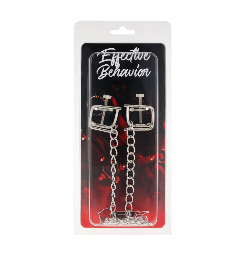 Vice grip style clamps keep your nipples erect and your body aroused! The adjustable vice applies pressure to your nipples with a slight turn of a screw, escalating the tension when desired. With the connected chain applying the right amount of pull on your nipples, you will feel increased stimulation with every move! Have your partner lightly tug on the chain for some added control and kink in the bedroom! Perfect for nipple play beginners or for those wanting to add something to their bondage repertoire.