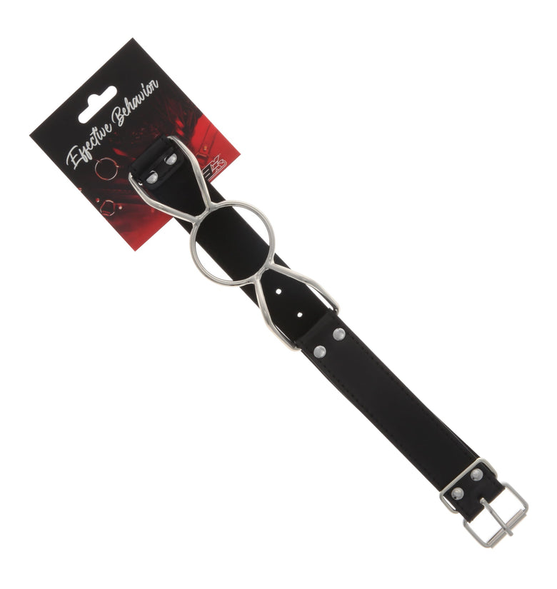 Fulfill extreme fantasies with this 53X gag restraint. The gag itself is made of solid steel, with a curved loop on either side to wrap around the wearer's face. The two PVC straps are adjustable and fasten in the back with a simple buckle clasp for easy maneuvering.