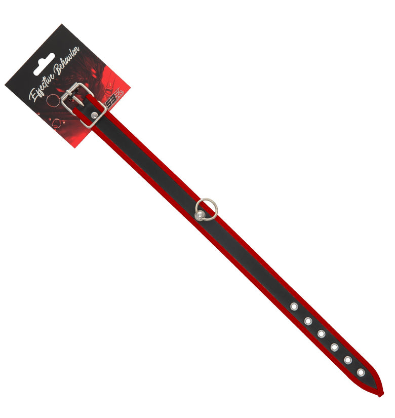 Flirty and sleek, this bondage collar is made of premium PVC, with a bold white border. The collar features a single loop ring in the front and a sturdy buckle clasp in the back. Perfect for dressing up - or wearing nothing else - spark excitement while wearing this effective behavior accessory!