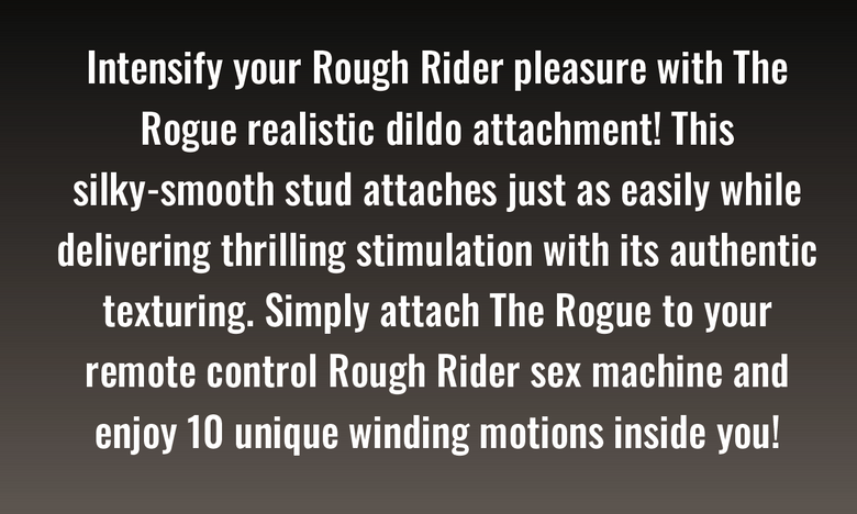 Intensify your Rough Rider pleasure with The Rogue realistic dildo attachment! This silky-smooth stud attaches just as easily while delivering thrilling stimulation with its authentic texturing. Simply attach The Rogue to your remote control Rough Rider sex machine and enjoy 10 unique winding motions inside you!
